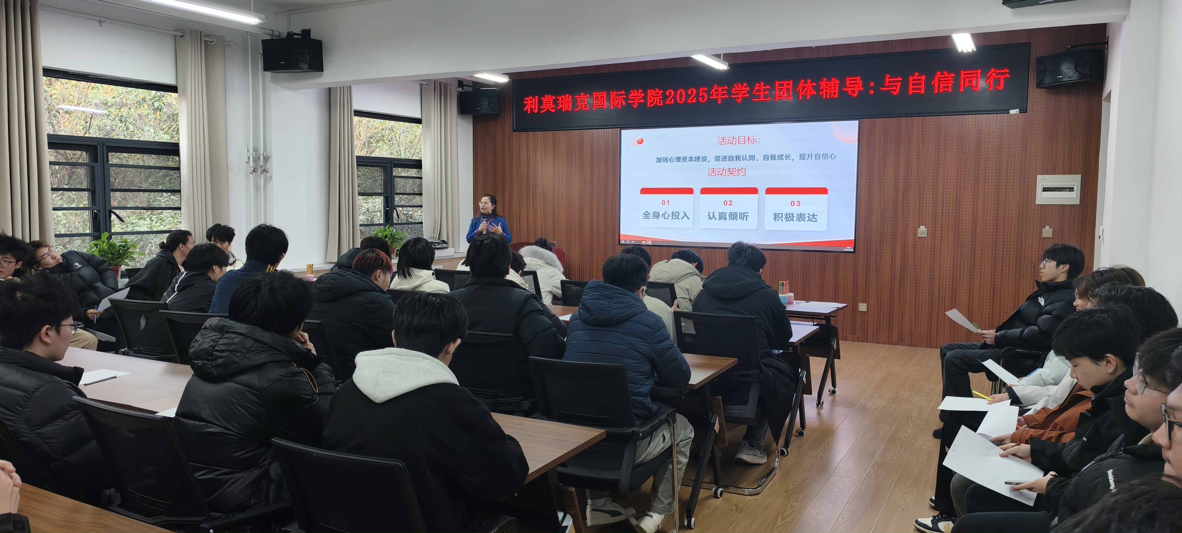 活动由我校心理咨询中心潘子彦老师主讲。她精心设计了“大风吹”“戴高帽”“献计献策”“目光炯炯”“自尊宣言”“分享感受”“合唱一首歌”的富有情绪价值的多元互动环节,极大地激发了同学们的参与热情,参与的同学在互动、赞美和欣赏中添加了愈发深厚的情谊。活动最好,潘老师引导大家分享感悟,从心理学角度解读自信建立与团队协作的内在关联,并传授正面自我对话、压力调节等实用技巧 。