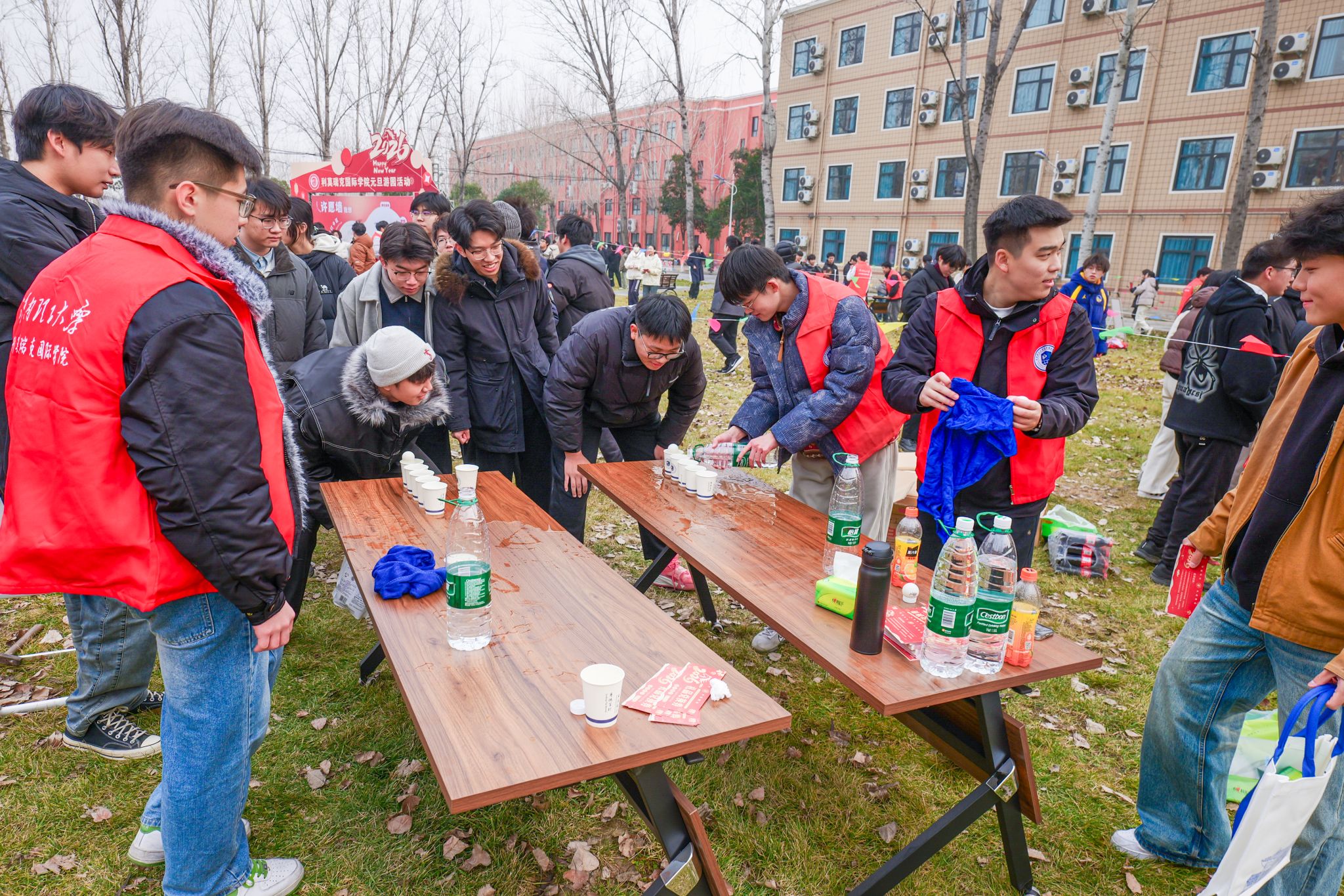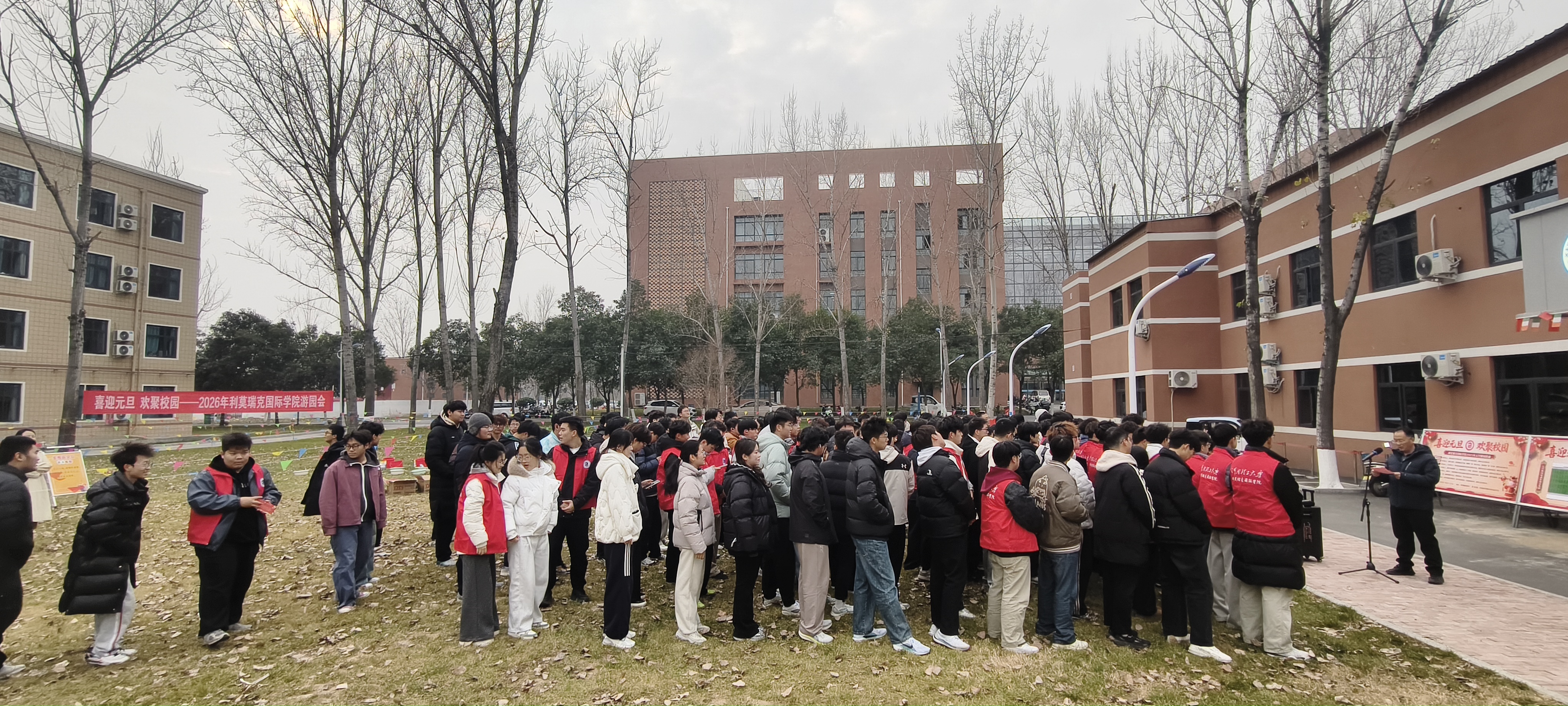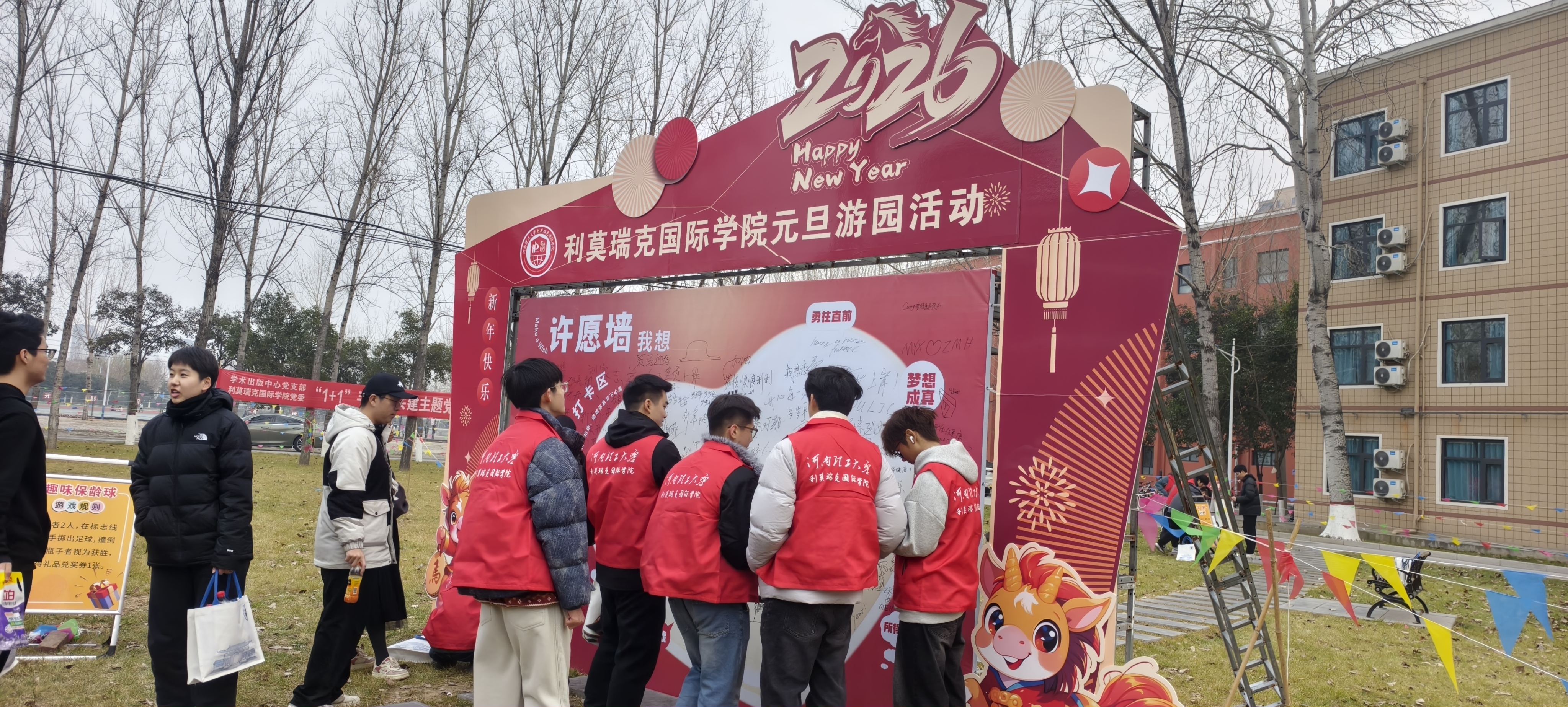 为确保游园活动顺利开展,学院领导带领学生骨干、志愿者们提前进行了周密筹备:从游戏项目的筛选、场地的规划布置,到游戏道具与奖品的采购与分装,每一个环节都力求细致。活动当天,学院楼前张灯结彩,红展板、小彩旗相映成趣,游戏区域依次排开,工作人员在各自点位引导秩序,洋溢着浓浓的新年气息。