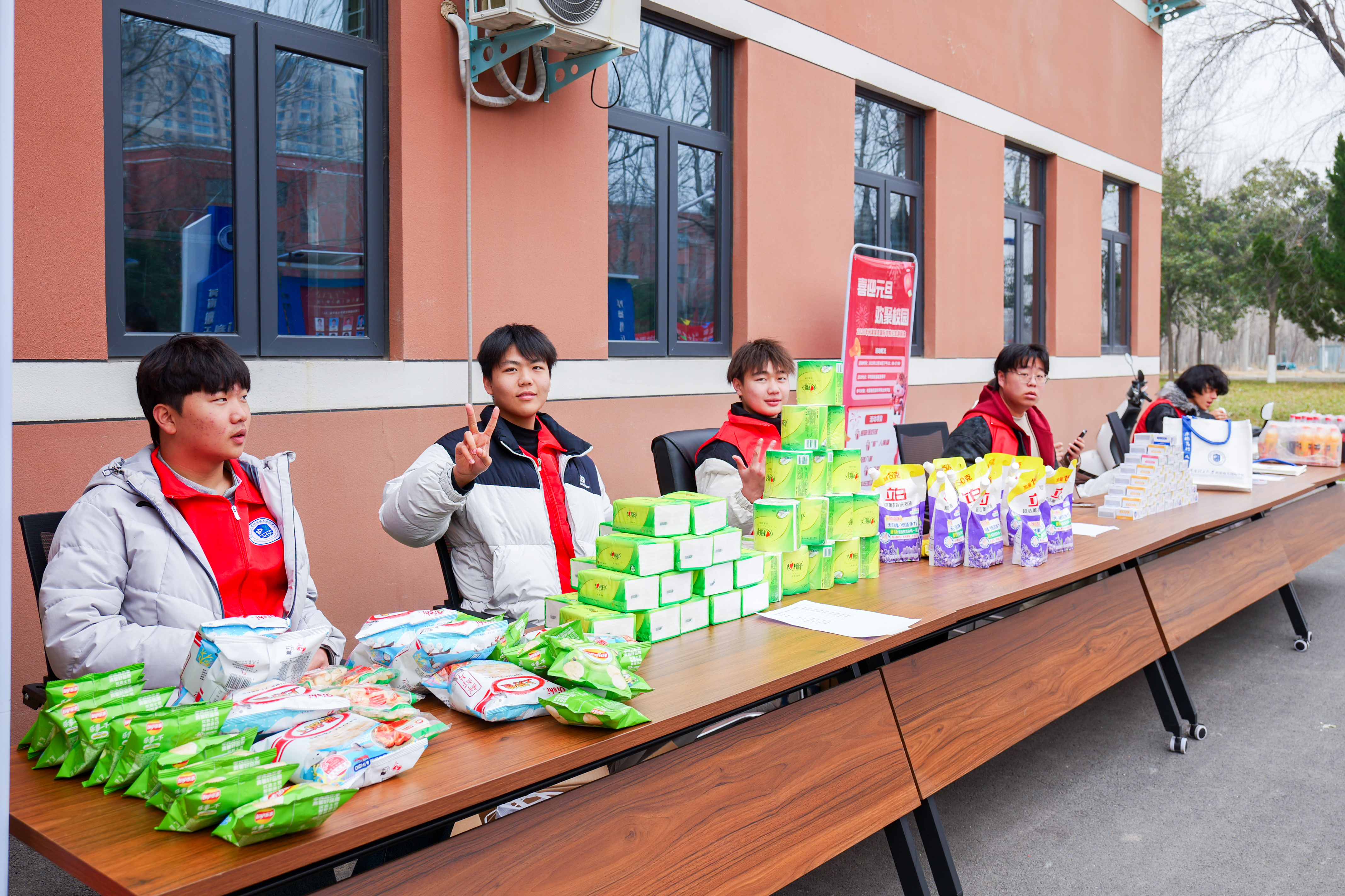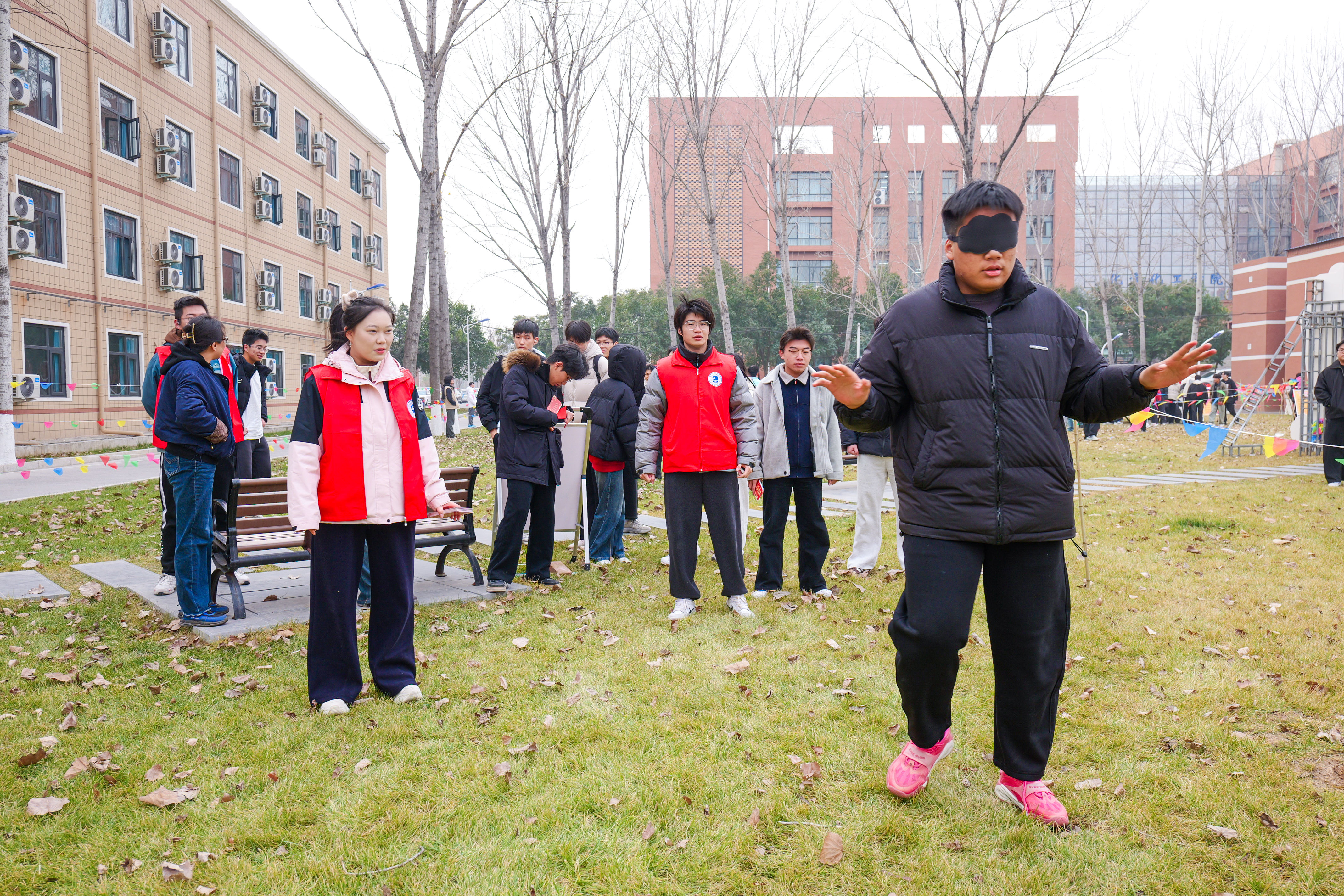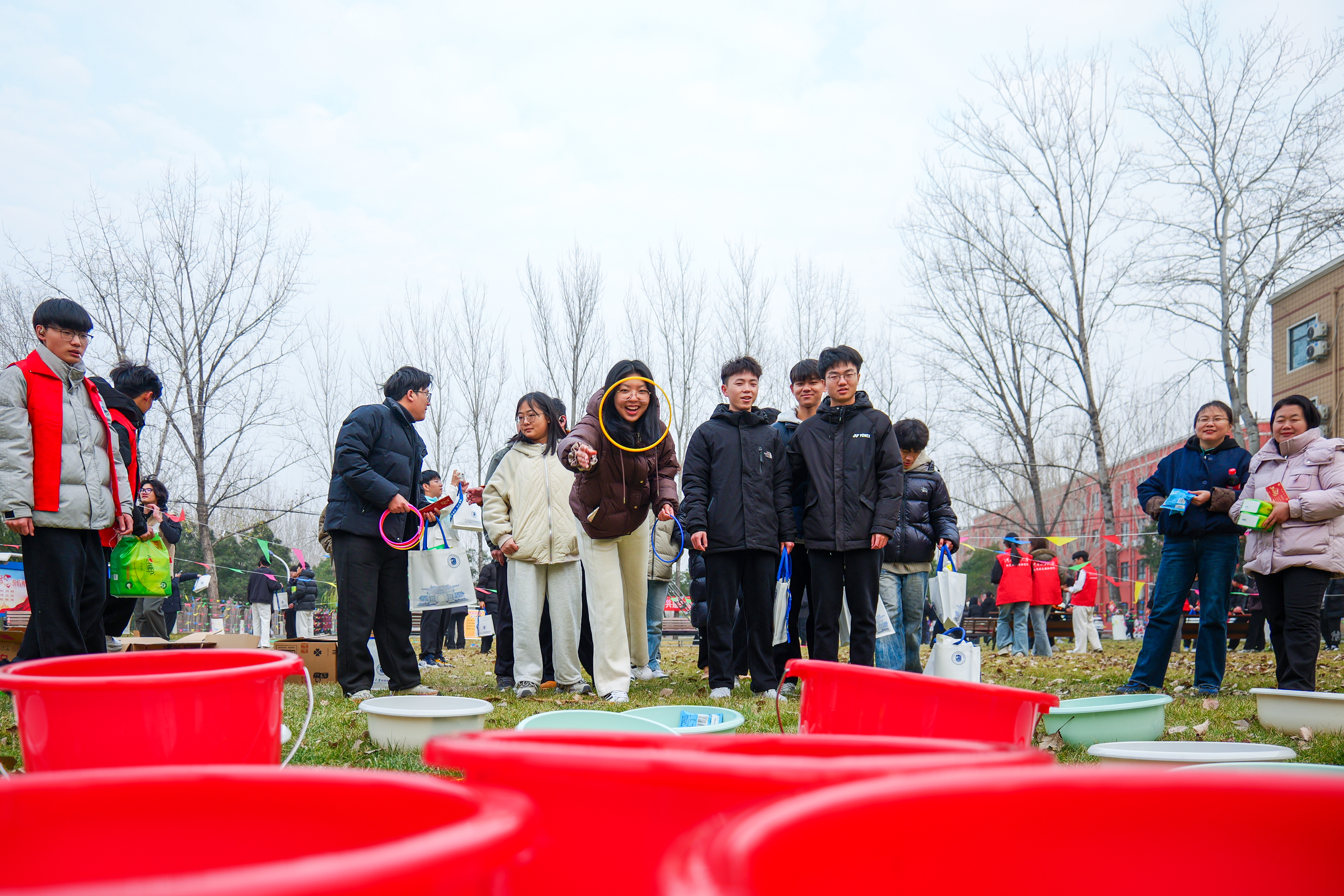 为确保游园活动顺利开展,学院领导带领学生骨干、志愿者们提前进行了周密筹备:从游戏项目的筛选、场地的规划布置,到游戏道具与奖品的采购与分装,每一个环节都力求细致。活动当天,学院楼前张灯结彩,红展板、小彩旗相映成趣,游戏区域依次排开,工作人员在各自点位引导秩序,洋溢着浓浓的新年气息。